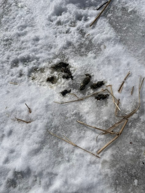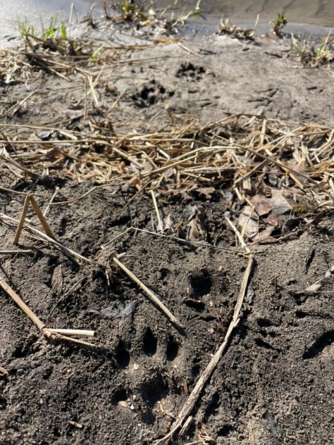 River otter’s tracks are quite large, usually measuring around four inches. They will often lope, or bound through the terrain (most commonly around 16″ between 2×2 lope clusters), with their signature slide appearing intermittently throughout their course. Compared to the American Mink, their slides are much wider, usually measuring up to 12″ wide, and appearing on not only downhill spots like mink do for efficient travels, but Otters do it for play as well, thus sliding on flat ground and even sometimes uphill.