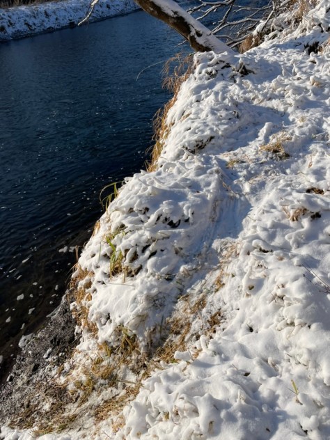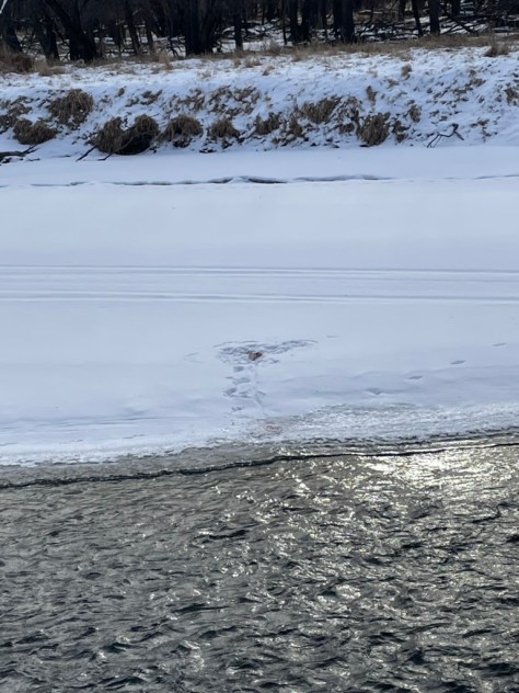 River otters earn their name by spending the majority of their time in, on, and around rivers. They are known for their playfulness which is clearly seen in the signs they leave behind from their nocturnal rompings. Their sleek fur provides a slick coat upon which to slide down the river banks, either snow or mud, and across icy river surfaces. Sometimes choosing this mode of travel over their all fours out of sake of speed, but other times it seems apparent to be chosen for pure pleasure: for play.